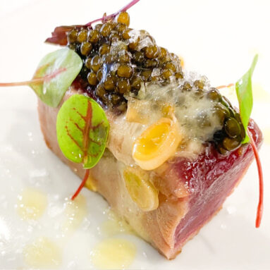 En su enfoque gastronómico, en su visión de la cocina, Santi Ortiz fusiona lo moderno y lo ancestral, con un profundo respeto por los productos milenarios que nacen de la dehesa, especialmente el AOVE, su emblema como un producto al que trata como el tesoro que es para realzar cada plato.